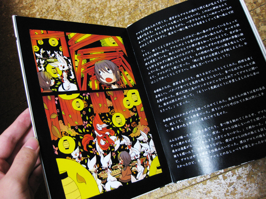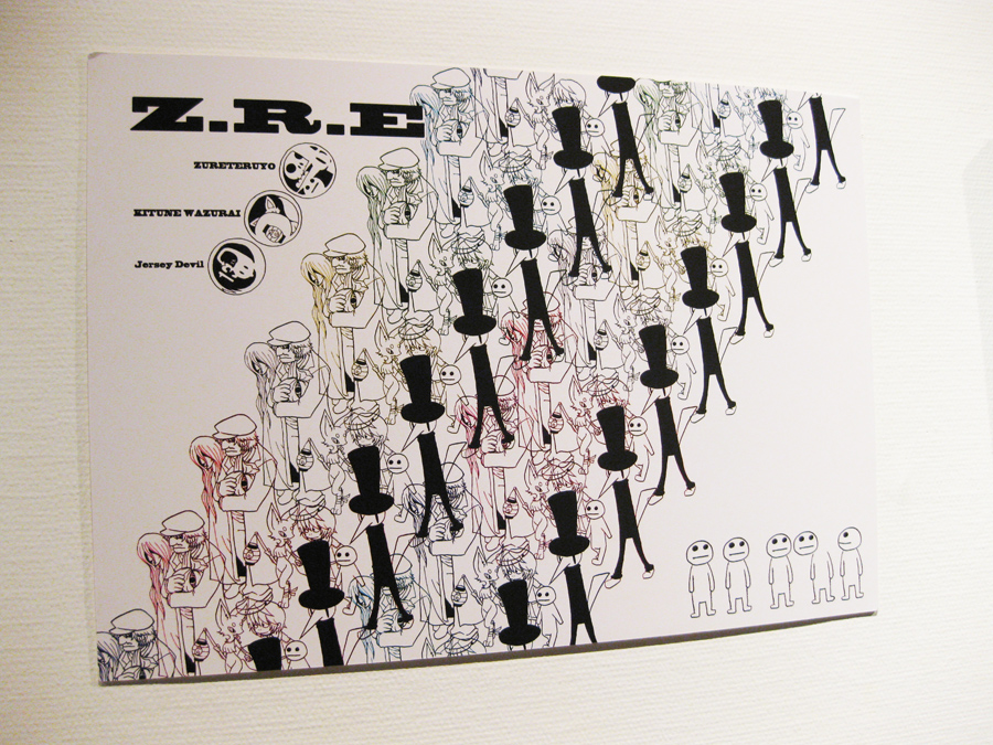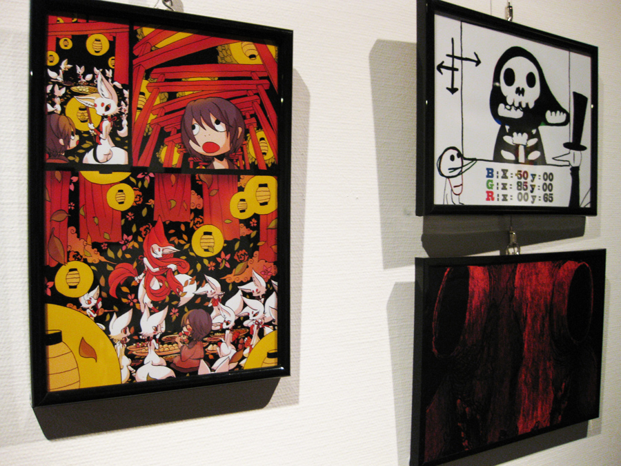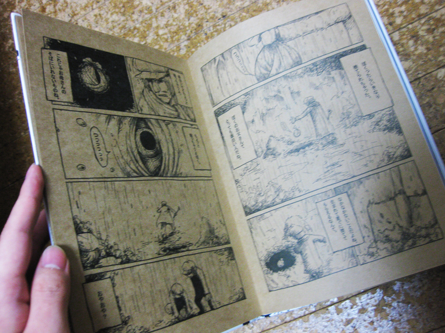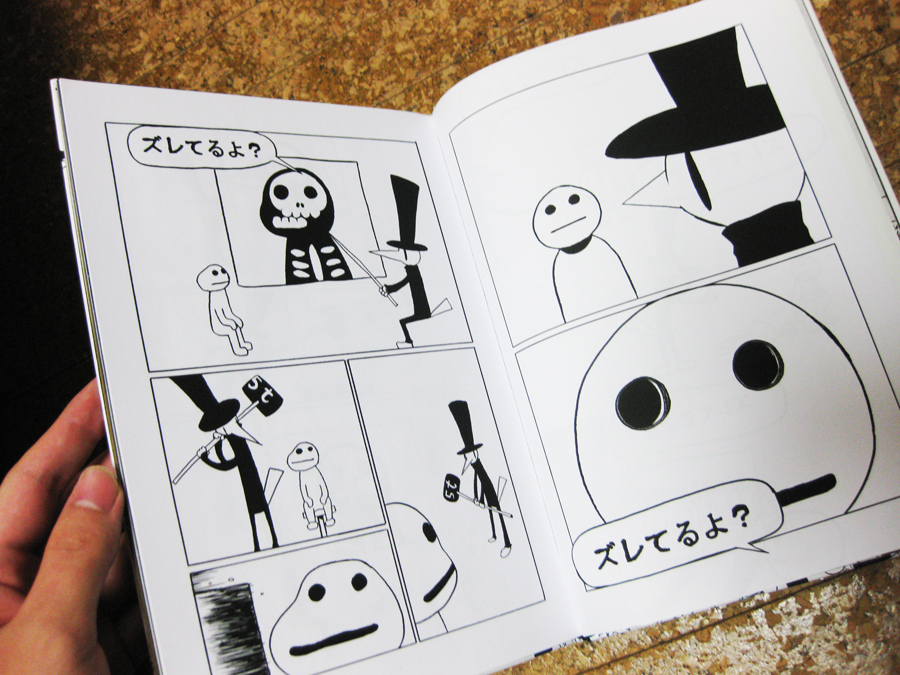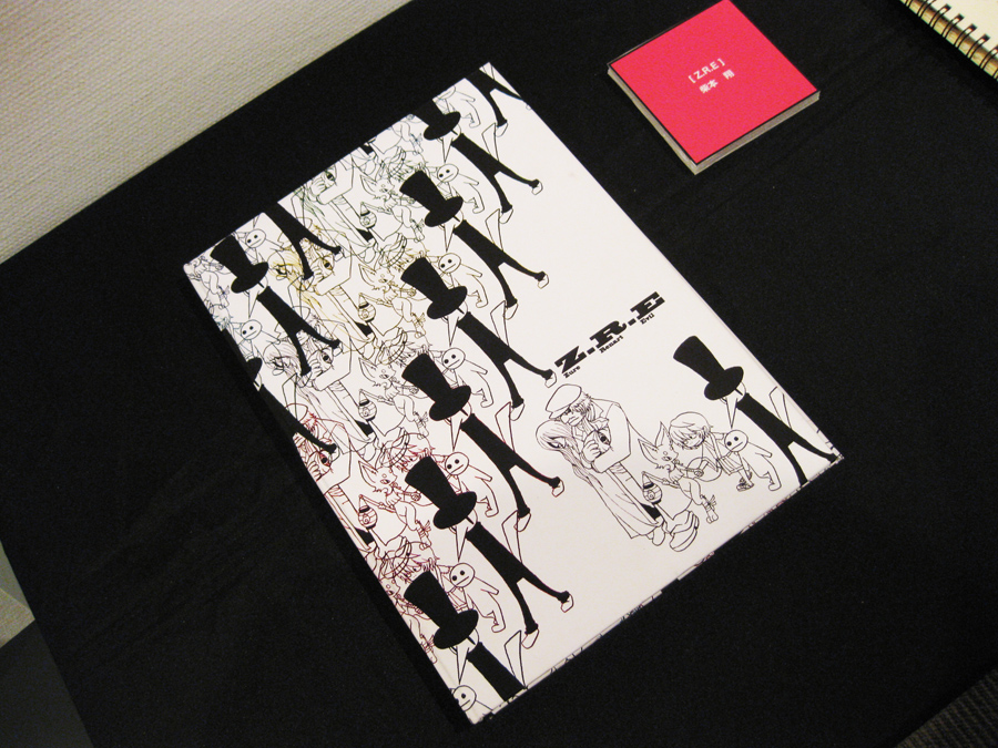 先日無事、「ズレてるよ?展」を終える事が出来ました。ギャラリーまで足を運んでくださった方々、僕の作品を読んでくださった方々、感想ノートにコメントを残してくださった方々、差し入れをして下さった方々、どうもありがとうございました! 個別差し入れのおしゃぶり昆布梅美味しくその日のうちに完食させていただきました。 やめられないとまらない昆布梅!! そういえば今回僕が作った本の紹介をここであまりしていなかったので多少紹介を。 はい! ちなみにこれギャラリーで撮って裏表紙だったのを後で気付きました 笑。 だからはい!家撮影! ハードカバーです。頑張って作りました。手作業なので一冊作るのに結構な時間がかかり、ハードカバー本の個人量産は無理だなと思いました。 この本は以前の記事でも言ったように、大きく三つの短編の入ったものになっています。 DMのキャラを使った「ズレてるよ?」と、 文章に漫画風コマ割りの挿絵がついた「狐煩ひ」と、 正直ひかれるかなとか嫌われそうだなとか考えながら描いた「ジャージーデビル」の三本です。 それぞれ作品に合わせて、印刷する紙を変えたりしました。 こんな 按配 にナ。 ただ、「ズレてるよ?」以外に使った紙が結構分厚くて、3ページ程剥がれてしまいました。普通のボンド接着だしね。 ちなみに題名の「Z.R.E」ですが、今回の展示のテーマ「ズレ」から取っているのは勿論ですが、実はそれぞれ短編のキーワードというか、内容に関わるものの頭文字だったりします。 Zは「ズレてるよ?」のズレの頭。Rは「狐煩ひ」の狐を意味するフランス語の「Renart(レナード)」の頭。Eは「ジャージーデビル」における純粋悪から、英語の悪を意味する「Evil」の頭。 なんとなく表紙に入る字ずらがカッコ良さそうなのを考えてて、なんとなく思いついた「ZRE」がそんな感じで関連した頭文字になってたんで即それに決定しました。予定していた三篇の挿入の順番と一致したのは完全に偶然です。 「ズレてるよ?」は人によっては声に出して笑ってくれたりで好評なご様子でした。看板とかDMにも使ったキャラ達だしね。 ちなみにこれ、DMが先行しているので、例のアゴの話と棺おけの話がリンクしてるのは完全に後付けです。時間があればもう何本か描きたかった。内容ないし、作画も超楽だし 笑。 「狐煩ひ」は登場する狐が性的だのエロイだのと一部に好評でした。全くみんな心が濁ってるナ 笑。 「ジャージーデビル」はやっぱり根本的に好みの問題があるらしく、好きな人は好きって言ってくれるけど、多分ダメな人は「何これ暗っ。」と、前の二編との落差にえ~と思われるみたいです。当たり前だよね 笑。 僕も下書きの段階は疲れました。でも結構ペン入れは楽しかったんだよなー。ガシガシ線描き込むのが楽しかったです。結構実験的にやってみたんだけど、この描き方は今後合う作品があったらまた使ってもええなと思いました。 しかし今回の展示で思ったのは、本、しかも漫画を展示するってことはちょっとリスクがあるなという事。 やっぱり『漫画』ってだけで読んでくれない人も多く、壁にこんな感じで一部抜粋やイメージを展示してたんですが、 それだけ眺めて通過してしまう人も何人かいました。 若い人は読んでいってくれるんですが、おじちゃんおばちゃんは人によっては手にとってもらえませんでした。 確かに、漫画好き嫌いもあるし、やっぱり読まなければならないので、必然的に拘束時間が長いのが単純にネックというのもあるかもしれません。 よく漫画作品を全部壁掛けで展示している人を、大学のオープンキャンパスや文化祭、卒業制作展などで見かけるのですが、僕はあれあんまり好きじゃなくて。 読みやすいんでしょうけど、やっぱり漫画はページをめくる行為にも意味があるものだと思うので。見る順番ミスると残念な感じになってしまうし。 なので、まだ形式が詳しく決まってませんが、卒制は漫画じゃないと思います。漫画だとしてもそれはいわゆる一コマ漫画的なものになると思います。 ていうかゼミ展が終わった今、今度は卒業制作がヤバイです。ヤダヨー 何よりもう学生生活が終わるっていう実感が凄くてヤダヨー ピューと吹く!ジャガーの襟立て患者Jのあのダメ人間台詞が身にしみます。 「社会出たくねえ…」 いえ、頑張ります 笑。 これ以上おうちの重荷になるわけにはいきません。 追伸、今回色々準備がごたごたしてしまい、送ろうと思ってた方に全然DMが送れなくて申し訳ありませんでした。次に何かに参加する時は必ず送るようにします。すみませんでした。