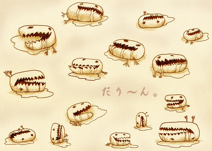 きゃらニメ工房っていう、タカラとかが主催のキャラクターやアニメーションを投稿するコンテストあるんですが、今第二回が開催中で、前回の受賞作を見たら割と何が受賞できるか分からない感じだったので、運よくお金もらえたらいいなーを少し試してみようと思い、それぞれ二秒くらいで浮かんだキャラクターを投稿してみました(どーん)。 去年の10月から12月15日まで投稿を募集していたのですが、その方式が月ごとの15日までに投稿されたものをその月末に審査し、二次選考に進むのですが、その二次選考は一般によるネット投票で、(ここどうなんだと思うんですが)審査通った時点で投票が始まるんです。つまり9月に投稿し審査を通った作品は、もう10月から1月まで投票を受ける事が出来る訳です。で、僕は12月15日に投稿しました(この方式に気付いたのは投稿後)。 これやっちゃったなーとは思いましたが、まあいいやってなってました。で、12月末になっても連絡が来なかったんで審査通らなかったんだろうと思ってました。けど、「どうなってるんだろあのコンテスト」と今回見直して見たところ、4つ投稿した内、4つとも一次審査は通ってました 笑。 投稿方式がネット投稿方式でお手軽だったので、調子こいて色々送って見たわけですが、周りの作品見る限り、結構一次は素通りっぽいです 笑。 で、これらが今回投稿したもの。 まず一発目。ここに以前載せたワンコ。考えもなくとりあえずラクガキしたもの。 二発目。これも以前ここに載せたもの。縦横無碍駅のウサギさんを(自分的には)一般向けに可愛くしてみた。 三発目。大学の課題で描いたものをもう、なんかネタで投稿。「よだれ垂らしてるキモイ生き物はこのコンテストの許容範囲か?」という。「明らかにネガなイメージは許容範囲か?」という。 四発目。「よだれの次はどこまでお色気オッケーか?」ということで投稿。でも流石にあんまりムンムンなのは描く勇気がなくかなり控えた結果、普通になった。 という、後半完全にコンテストおちょくったようなモノを投稿してしまいました。い…いや、おちょくってないよ!真剣だよ! これがきゃらニメ工房なるサイトhttp://charanime.seebox.jp/ で↓のリンク先がそれぞれの投票数&点数の現状です。 (結構あっちのサーバーの調子の関係で開けなかったりすること多いです。) 平面ワンコ http://chara2.seebox.jp/?c=charanime_detail&contest=charanime_contest_2&type=image&page_num=&contents_id=7YzrQ-2NhP-1CS28n-128 時計ウサギ http://chara2.seebox.jp/?c=charanime_detail&contest=charanime_contest_2&type=image&page_num=26&contents_id=7ZEIW-2hWH-17Du6e-4hE だるだる http://chara2.seebox.jp/?c=charanime_detail&contest=charanime_contest_2&type=image&page_num=26&contents_id=7ZC4Z-VRs-1xz5Nm-262 きつね http://chara2.seebox.jp/index.php?c=charanime_detail&contest=charanime_contest_2&type=image&contents_id=7YMSz-29il-MDgyp-7Dj ちょっとビックリというか本気じゃなかった分ショックというか(笑)、08/1/7現在、一番点数集めてるのがきつねさんです。 平面ワンコとだるだるは既にかなりアレですね。ウサギさんはこれから投票数伸びればいいなー。 もし良ければそれぞれ審査していただけると嬉しいです。もう一点でも投票してくださったら全然嬉しいですよ! 二月末には結果が出るそうです。ちなみに一次通っている作品数は1597あって(多いな 笑)、そのほとんどが0票作品で、一位の人の点数が既に671点獲得しています。投票数は227票です。うはー! なんで0票?っていうのも結構あります。その逆も 笑。
