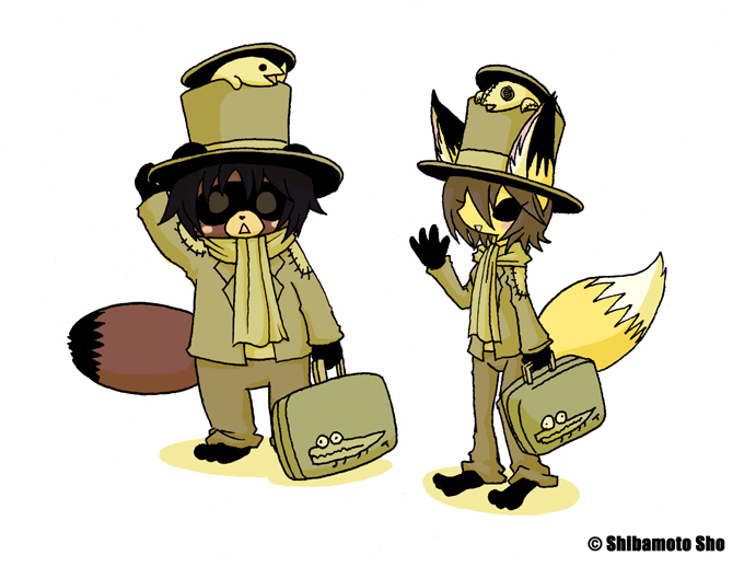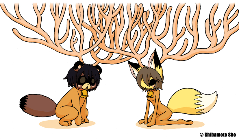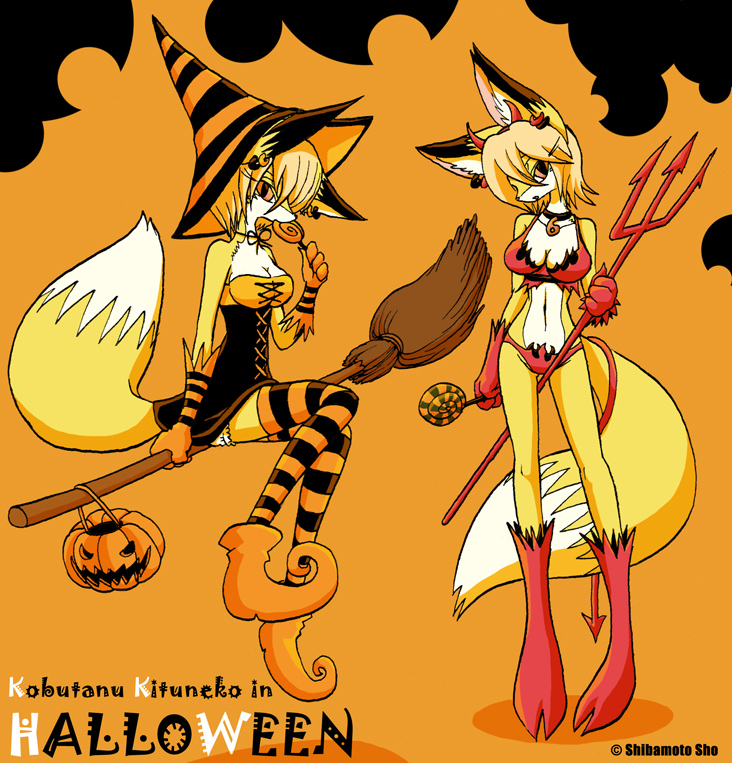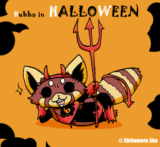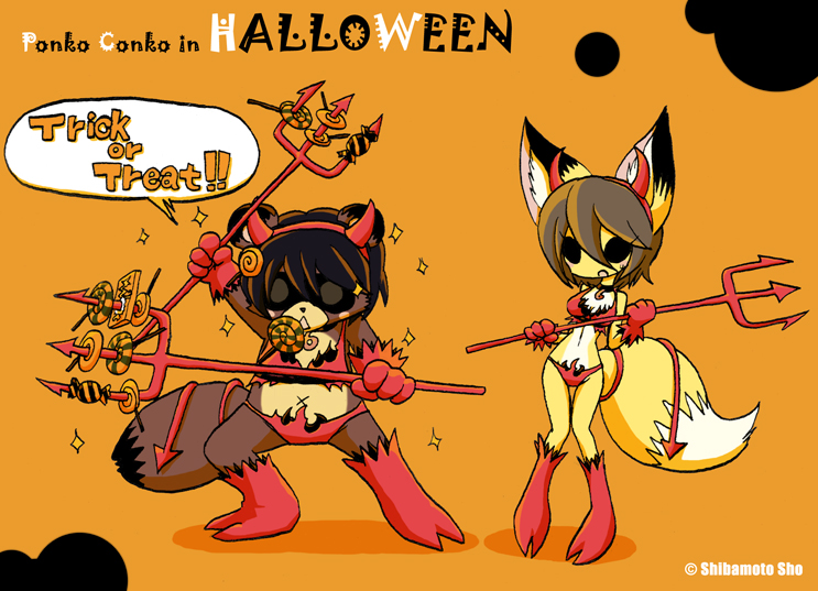 「今まではセクシーなガールズやワイルドなメンズの為の衣装をデザインしてきた訳ですが、最近、小、中学生向けの物も作るようになったんです。ただ、今までのイメージが強かったせいか売れ行きが伸び悩んでましてねえ。そもそも店が分かりにくい所にあるので、今までもほぼ固定のお客さんにしか足を運んでもらえない店でしたし。 しかしハロウィンが近いという事で、子ども向けに仮装衣装のフェアをしようと思ったんです。そうすれば普通の服の方も注目してもらえると踏みましてね。しかしそれも結局広告が弱かったせいかそれもあまり巧くいかず、困り果てていたんです。 その時たまたま、二人の学生さんが店にいらしたんです。愛らしい狸と狐の女の子でした。話を聞けば、狸の子が突然壮絶な尿意を静かに催したということで、トイレを貸して欲しいということでした。尿意を催してる本人は無表情で、連れてきた狐の子の方が焦ってる様子でした。 さて、狸の子がトイレを済ますと、二人はお店の品を見始めました。二人はハロウィンの仮装コーナーで何やら盛り上がってるようでした。話を聞いてみれば近く、街でハロウィンパーティがあり、その服を探していたとのこと。どうも魔女の衣装を気に入ってくれたようでした。 正直この時点で、フェアは失敗と思い、赤字にはなってしまいますが処分しようと思っていたので二人に「タダであげるよ。」と持ちかけました。 けれども狐の子がトイレを貸していただいてるし申し訳ないですと引き下がらなかったので、内緒で半額以下の値段で売ったんです。二人とも嬉しそうでした。 次の日、驚いた事に近所の子らがうちの店に沢山訪れてきました。皆ハロウィンの衣装が目当てのようです。ある子に聞いてみたところ、どうもあの二人が宣伝してくれたようでして…その日の内に完売になったんです。ハロウィン衣装以外も結構な数が売れました。 街のハロウィンパーティ当日の、日が落ち始めた頃、二人は買っていった衣装を着てお店へ来てくれました。狸の子は大量のお菓子を獲得しご満悦、同時に五本のペロペロキャンディーを頬張っていました。 二人はこの後、ひよこ産業主催のハロウィンパーティに参加する予定という事で、私は店を宣伝してくれたお礼に、二人にデビルな衣装をプレゼントしました。展示用の非売品、デビルなフォークも一緒に。狸の子はフォークを大層気に入ったようでした。もう一本所望されたので、私は快くプレゼントしました。 二人は大喜びでした。二人は今でもウチのお得意さんです。」 ―以上、服屋のふくろう、服郎さん(45)によるインタビューより。 「その日はひよこ産業本社におけるハロウィンパーティの日でした。パーティといっても、社員と幾人かの関係者のみでの、小規模な仮装お菓子パーティみたいなもんです。 皆思い思いに、ドラキュラだのフランケンシュタインの怪物だのメデューサだのグレムリンだのネッシーだのモスマンだのクッシーだのヤッシーだのヨッシーだのオゴポゴだのジャヴァウォックだのグエムルだのエイリアンだのプレデターだのETだのヘルボーイだのエイブだのペイルマンだのパンだのナズグルだのアングマールだのサウロンだのミスターウィンクだのジェイソンだのフレディだのチャタラーだのブランドルフライだのチャッキーだのブギーだのエレファントマンだのドクターマンハッタンだのロールシャッハだのジョーカーだのトゥーフェイスだのエレキングだのゼットンだのガッツ星人だのペロリンガ星人だのシーボーズだのバルタン星人だのジャミラだのベムラーだのピッカリリカスだのティティモンだのピカチュウだのカイリューだのヤドランだのピジョンだのコダックだのコラッタだのズバットだのギャロップだの、サンダースだのメノクラゲだの、パウワウカラカラタマタマガラガラフシギダネだの、 とにかく色々な仮装をしてましたよ。一人、鶏のかっこしてきた奴がいて、流石にそれには苦笑しましたが。 さて、パーティは平和に進行していましたが、途中でやってきた、ある狸の女の子の暴走で事は急転しました。 その子は以前にも節分の会に招かれ、大破壊を巻き起こした子でした。誰が呼んだのか知りませんが、それは当然のように以前の再現となりました。 彼女は真っ赤な悪魔的姿に悪魔的フォークで、縦横無尽に走り回り、次々とお菓子を獲得していきます。我々はというと、既に始まってしばらくしていたので皆一品はお菓子を持っている状態でした。 彼女はテーブルのお菓子を平らげると、社員目掛けてフォークを振るい始めました。社員の持つお菓子が次々とフォークに刺さり、狸の少女の下へ引き込まれます。我々はこれは渡さん、と、フォークを懸命に掻い潜ります。しかし、狸の子のフォークさばきはなんとも正確。それはまるで獲物を攫う隼のよう。 狐の子が彼女を止めようと狸の子を追いかけます。狐の子は本来狸の子より運