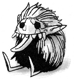 一匹は盆を垂直に立てたものに目鼻口を付けて、上に生えた取ってのような二本のツノと、下からは同じように生えた手のある顔の、毛むくじゃら。
