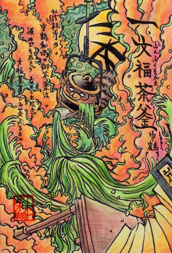 僕の絵だと直接狸が茶釜になっていますが、本来は狸が化けた和尚です。その和尚が持っているのが汲めどもお茶の尽きぬ「文服茶釜」。でもほら、このが可愛いですよね 笑。
