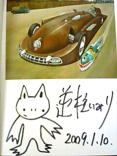キョキョキョキョ。 中野ブロードウェイにある、タコシェというマニアックな漫画を置いてる店で只今逆柱いみり個展『臍の緒街道』がやっています。 昨日が逆柱いみりさんが来店とのことでしたので、akitoさんと行ってきました。 タコシェが狭い店なのでゆっくりは観れなかったけど、相変わらず独特の既視観を覚える夢のような異形のリゾート。毎回単行本のアタマにイラストが何枚か載っててそれは観ていた訳ですが、生の絵は予想以上に綺麗でした。色もいい感じで、お金があったら欲しいくらい。上の画像の画集で我慢しました。 で、逆柱さん本人にも会うことができました!サインもして貰ったよ!! ネコカッパ可愛い ホントは少しでも話せたらなーと思ってたんだけど、次のお客さんが待ってたんで握手だけしてもらいました。 一番聞きたかったのは「空の巻貝」の単行本はいつ出るんでしょうか!!」ということ 笑。 あとついでだから借りて読んだ赤タイツ男(危険本)もこの機会に買いました。いみりさん来店アワーに合わせてか、積みあがっている赤タイツ男の中に一冊だけ直筆サイン入り本を発見。どうせだからと下から無理やり引っ張り出して買いました。 これがそれ。大体同じ 笑。 しかし生でサイン貰ったの初めてです。嬉しいなあ。アレはいいもんですね。 つかこれで『象魚』、『臍の緒街道』、『赤タイツ男』と、僕が持ってるサインは全部いみりさんです 笑。 逆柱いみりさんはなんか変な話ですが見事に予想通りというか、思ったとおりの感じの人でした 笑。良さそうな人だったです。 あーー!ケキャール社顛末記が欲しい!!誰か定価で譲って!!!! あと、99年に小学館から発売されて絶版になっていたヘルボーイチェインドコフィン(縛られた棺)を発見したので買いました。定価より400円程高かったけど、アマゾンとかで買おうとすると二倍以上とか馬鹿みたいな値段になってるので(まあ、馬鹿みたいな値段で象魚は買ってしまったけど 笑)半分諦めてたので買えて良かったです。 滅びの右腕も一緒にあってどっちか迷ったんですが、古いほうを選びました。しかしそのうちそっちも…!! 二冊買うには金が足りなかったです。 チェインドコフィンは破滅の種子や魔神覚醒と違って短編ものを収録したタイプで、表題の『縛られた棺』と『聖オーガストの人狼』が結構面白かったです。『屍』もキャラがいい感じだったし、『バーバ・ヤーガ』と『地の底のクリスマス』は雰囲気が良かったです。『巨人の如き』は魔神覚醒の気になる続きだったので読めてよかった。 まあ要は全部面白かったです 笑。 ヘルボーイのいい人っぷりと、ダイハードのマクレーンみたいに文句たれながら戦う感じがまたいいね。 それにしても昨日は久々に沢山漫画買ったもんだ…