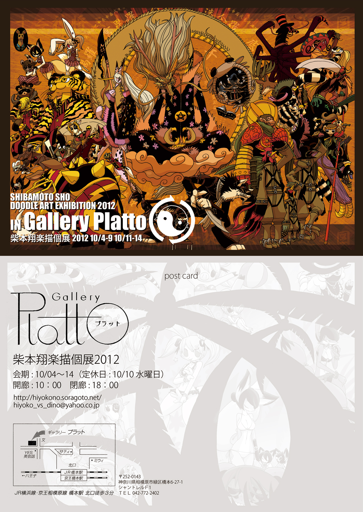※DMのデザインがもろもろ間に合わせ過ぎじゃないかというツッコミは受け付けておりません。※ 2012/10/04~10/14 (定休日10日火曜) 10:00~18:00 橋本駅近くのギャラリー・プラットにて、10日間のイラスト個展をする事になりました! 新作という新作はなく、展示作品はホームページで見れるものばかりですし、前回のにわとりひよこ展の時よりもイラスト数は減ってしまいます。 しかし今回はツノウサギの生の原稿を、ファイルに入れた状態で閲覧出来るようにしようと思っています。未定ですが、出来れば全ページを展示する予定です。 また、前回に引き続き、昔の自主制作本や、IKKIに一度載ったきりの読みきり漫画 empty head や Baku も読める形で展示予定です。 現時点で価格は未定ですが、今展では、展示イラスト作品やポストカードの販売も致します。 こちらも明確な日程は決めていませんが、僕自身も会期中に足を運ぶ予定です。出来れば、6・7・8の三連休に顔を出せたらなと考えております。 未定の部分は確定次第、またお知らせします。 慌しい告知ですいませぇん。そいでは、宜しく! ※追記 三連休に加え、12日金曜の午前中・13日土曜の午後、14日は一日顔を出すことにしました!宜しくお願い致します。 今回の展示で販売するポストカードの絵を何にするか現在迷っています。 そこで、このページを見てくださっている方で、何か希望するものがありましたら、是非参考にしたいので教えてください! ギャラリー1・2にあるイラストならどれでも挙げてもらって構いません。 一応、3~4種類ほどポストカードにしようかなと思っています。 ※既に希望の募集は終えています。リクエストを寄せて下さった皆様、ありがとうございました。 関連 http://hiyokonikki.blog.shinobi.jp/Entry/335/ http://hiyokonikki.blog.shinobi.jp/Entry/337/