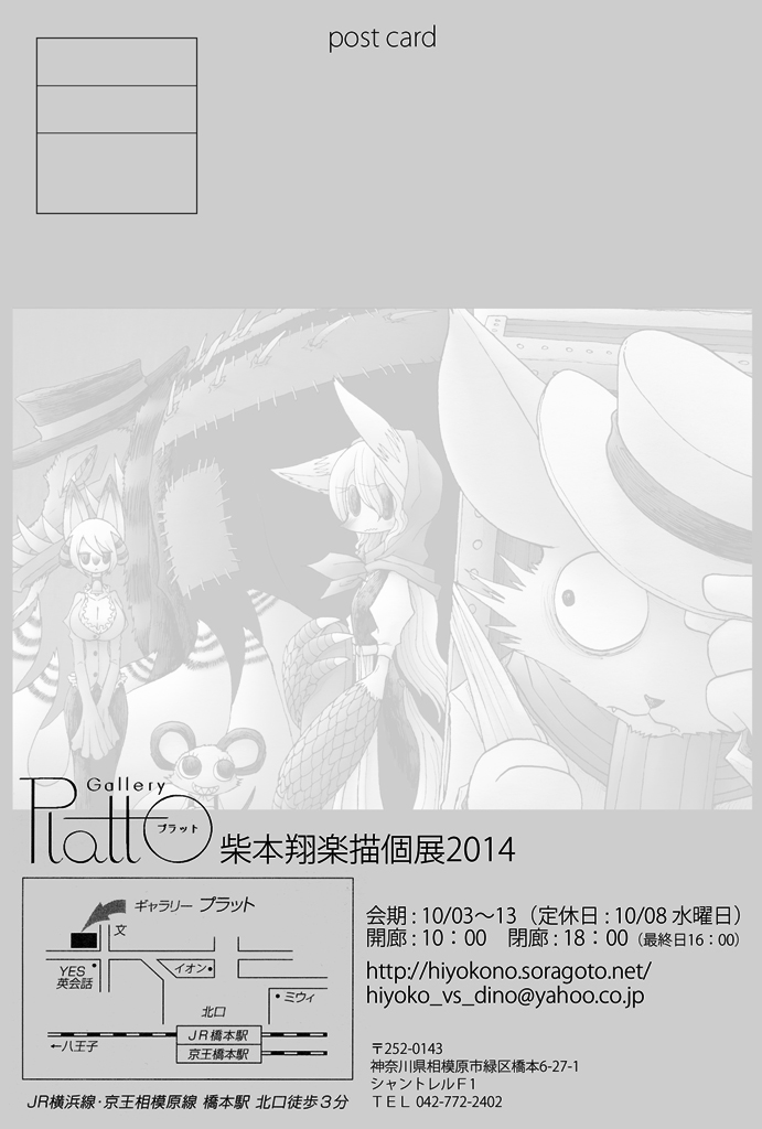 個展会期10/03~10/13の内の土日と最終日(4,5,11,12,13日)の午後にギャラリーへ行こうと思います!また奥で何かしら作業しているかもしれませんが、お気軽にお声かけください。