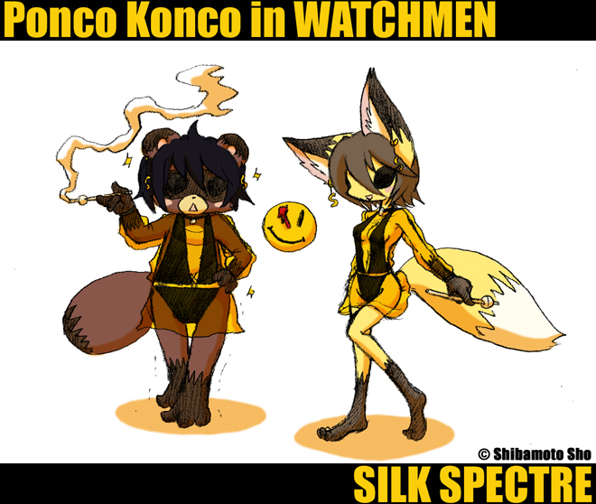 ぬーん 漫画版シルクスペクターなポン子コン子。ポン子はつま先立ちで背伸びしてるよ。 この絵も結構前に描いた絵なんだけど、随分前に友達に借りてウォッチメン原作を読みました。 とても面白い。小説のようでいて、これはコミックの形だからこそ、この形式だからこそ面白いというか。話と話の間に毎回、登場人物の書いた本の抜粋や、新聞記事、精神科医のカルテやらが挿入されているのも面白いし、それが読み進めていくと本編に大きな繋がりやヒント、世界観の掘り下げに一手を担っていて、単なる補足の域を超えてこれさえもこの『本』の仕掛けになっていました。 全体に漂う渋い雰囲気。ヒーローたちそれぞれのドラマ。毎チャプターの締めの引用もカッコイイ。 映画版の感想で「とても面白かったけど、星三つくらい」みたいな事書きましたが、なんか原作読んで色々そう感じた理由が分かりました。 多分この作品は、確実にグラフィックノベルという形がベストなんだということ。まあ、原作ものにそれは付き物っちゃあ付きものなんだけど、ウォッチメンは確実にそれ。 扱っているものも話のスケールも、キャラ一人一人のドラマも、とても2時間3時間で描くのは到底無理だと思う。新聞屋のおじさんと、コミックを読みふける青年のエピソードは、映画版では『あの』シーンでちらっと映るくらいでカットされてる。けど、あれは結構意味の大きいエピソードだったと思います。確かにストーリーを時間内に追うにはカットするしかなかったのかもしれないけれど。 もう一度映画版見た後の感想を自分なりに再確認してみると、 「世界観にも、キャラクター(主にロールシャッハ)にも惹かれるし、面白い要素も多い。はっきり言って好きなタイプな映画だ。けど何かが…」 映画版はこれだけの内容の漫画を一本に収めるために、ストーリーを追うのに忙しくなっている感じがしたし、 観てるこっちもキャラクターを覚えるの、その関係を読むの、この後の展開を予想するの、そしてこの黒幕は誰か!?を探るので、難しい話ではないし分かりにくくはないのだけど、非常に忙しい(言い換えれば充実した?笑)事になるので、それこそこの作品が元々持ってる色んなテーマだのメッセージだのを受け取るよりも先に、結末が最後の印象になってしまってました。 それこそネタばれというか、例の黒幕は誰だ!の部分は割りと予想通りに、しかも「それって完璧かなあ」な感じなので、「面白かったけど名作かどうかは」みたいな印象に僕はなってしまったんだと思う。 その点、原作は自分のペースで読めたので十分に楽しめました。 映画で描ききれてなかったキャラクターの面も充実してて、ジョンやコメディアンだの他のキャラも原作の方が魅力がありました。映画版はロールシャッハ以外が物足りない気がしたので。 まあ映画レンタル始まったらまた借りて観るけどね!! ウォッチメンは動と静でいったら確実に静の漫画。けどチャプター毎に読んだあとに残るもの、満足感は毎回大きいです。 多分採算が合わないから無理なんだろうけど、超金かけてチャプターずつ完全再現した(といってもまんまでは無理だろうから、余すとこなくうまく映像化するという意味)ドラマというかテレビ映画にしたら凄かったんじゃないだろうか。 まあ、なんにせよコミックがベストというところは揺るぎそうにないけどね。 そういえばウォッチメンの作者はVフォーヴェンデッタの原作コミックもやってるらしいのですが、あれも原作は面白そうだなあ。ちょっと読んでみたい。 因みに原作の方はアラン・ムーアという人なんですが、Vの映画化試写でその出来に怒ってしまい、今後自分のコミックが映画化されることがあっても、自分の名前をエンドクレジットに載せないでくれと言ったらしいです。 未確認だけど映画ウォッチメンにも名前出してないとか。
