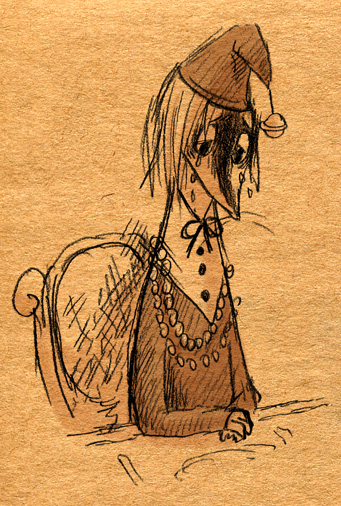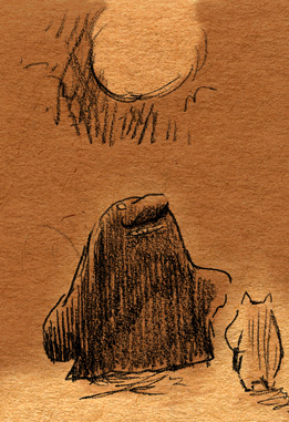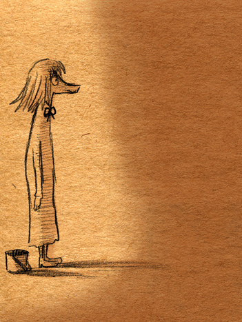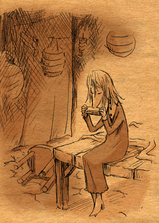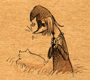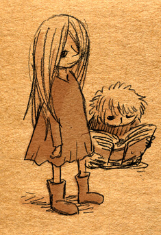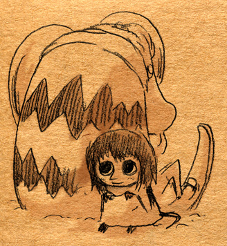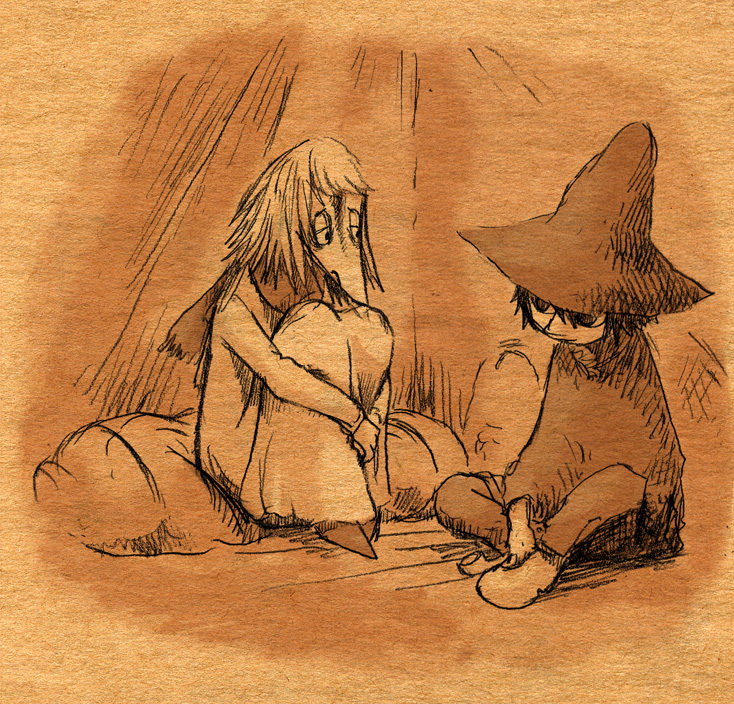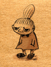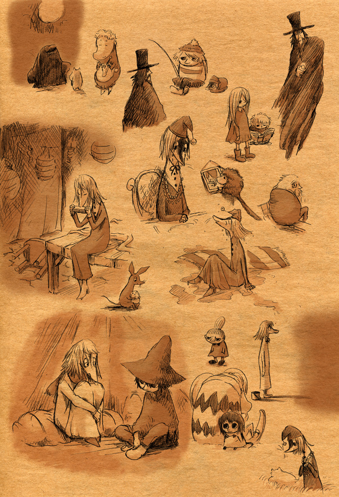 見ないで描いてみようなムーミン落書き。画像↑の各クローズアップも載せるよ。 「そういえば、トーベ・ヤンソンの絵も世界観も好きなのに、ムーミンはコミックと、ムーミン谷の彗星・ムーミンパパの思い出くらいしか読んだ事なかったなあ。」 と、思ったのをきっかけに、今回図書館で借りて彗星から全巻あらためて先週五日間かけて読んでみましたというお話。 (そもそものムーミンとのファーストコンタクトは古くて、幼稚園児かそれ以下くらいの時にアニメの『楽しいムーミン一家』の絵本を読んでもらいまくったところにあり、そういえばムーミンワールドとのお付き合いは長いのでした。) かなり面白かったです。完全にハマリました。オススメです。以前ヤンソンさんとその弟さんが新聞に連載していたコミック版を読んで、アニメムーミンがいかに角が落とされてしまったものだというのは思い知っていましたが、原作童話はまた更に素晴らしいものでした。 キャラは濃いし、ほのぼのとは程遠いです。不気味さと不安感が漂っています。しかし、その中に澄んだ暖かさがあります。アニメなムーミンしか知らない方には是非読んでいただきたいです。 最初、古本屋で文庫本を集めようと近所を回ったのですが、一冊しか手に入りませんでした。今ではその訳がよく解ります。手元においておきたくなるんです。僕もそのまま全巻セットをアマゾンで注文しちゃったくらいです。お金ないのに。 色々書きましたが、とにかく僕が言いたいのは友達と原作ムーミントークがしたいのでみんなも読んでくださいってことです 笑。 原作と他の作品とでそれぞれ微妙にキャラの印象が変ったのですが、中でも原作を読んですごく好きになったキャラクターがいます。一口に名前をいっても、同一人物ではないんですけれど。 上の落書き全容を見れば何となく解るかな。フィリフヨンカという、穴熊だか狐だか狸だかな細っこい女性です。 フィリフヨンカというのは種族名で、同種族の女性は皆フィリフヨンカという名前です(男はフィリフヨンクで共通なのかな?)。まあムーミンシリーズは主人公からして種族名ですしね。ザラです。 おしゃまさん(トゥーティッキ)はボーイッシュでクールな女の子だし、ミムラねえさんも良いキャラだし、ちびのミイはハードボイルドでカッコイイし、はい虫のサロメちゃんは健気だし、ムーミンママは素敵な女性。 こんな按配に魅力的な個性の女性陣がムーミンにはたくさん登場する訳だけど、僕はどうしてもフィリフヨンカが気になってしまいます。 神経はその身のごとく細くてヒステリックだし、余裕はないし、大概謎の恐怖に取り憑かれているしで、(こう書くと散々だな 笑)包容力のあるムーミンママとは真逆なキャラクターなのですが、どうしても彼女が気になってしまいます。ほうっておけないというか。 そんな訳で気付いたら他のキャラさしおいて何回も描いてるというね。 誤解があるかもしれませんが、弱い女性が好きとかそういう訳では決してないです。まあその辺は以下細かい感想で書きます。 <こっから先細かい感想書きになっちゃうので、ネタバレになりかねません。注意です。> 最初の方の作品は、不気味な影や災害、迫る終末の危機を感じさせたりするも、登場人物たちの活き活きとした感覚とのどかさで切り抜けていく、児童文学らしい気持ちよさがとても良かったです。ファンタジーな世界ではありますが、変に活劇シーンがあるわけでもなく、そして子どもだましでは決してない、ささやかで暖かいハッピーエンドが待ってます。 しかも、そのハッピーエンドは妙に感動を覚えます。 シリーズとしての一作目にあたる『彗星』は、冒険を前向きに、しかし使命感を持ちながら楽しむムーミンたちと、破滅的な情景がなんともいえないコントラストになってます。 その終末の風景はとてもイマジネーションに富んでいて、禍々しく、しかし冒険心をなんともくすぐります。怖いのだけど楽しい。本当は子どもが本当に好きな、怖いけどそそる世界がそこにありました。 何となく、ムーミンシリーズは進むごとに登場人物の―少なくとも精神年齢は―成長しているように思うのですが、一作目にあたる『彗星』では、幼い子どもたちの前向きに楽しく、終わり行く世界を冒険する姿が活きていると思いました。個性的ないつもの面々、スナフキンやスノークのおじょうさんなんかとの出会いもあって面白いです。 『彗星』はそれこそ本当に小さい頃に一度親に読んでもらったのが初めてでした。何年ぶりに読んだんだろ。ずっとスニフ=ゲロってイメージがあったんですが、確かに事あるごとに『げろはいちゃう!』と言っていました 笑。実際吐くしね。 某はい虫が可愛いです 笑。こういう笑いが初期の彗星~冬までには沢山あります。その後の作品にも、独特のおかしさはあって笑えるんですが、また少し質が違うかなあ。 たのしいムーミン一家はまたム