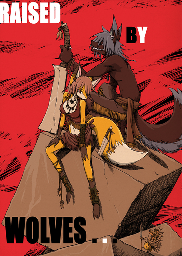 『RAISED~』の意味は『狼に育てられて』。後付で打った字だからなんのことだか。多分、右下のひよこがおおか美ときつね子に育てられたんじゃないですか。